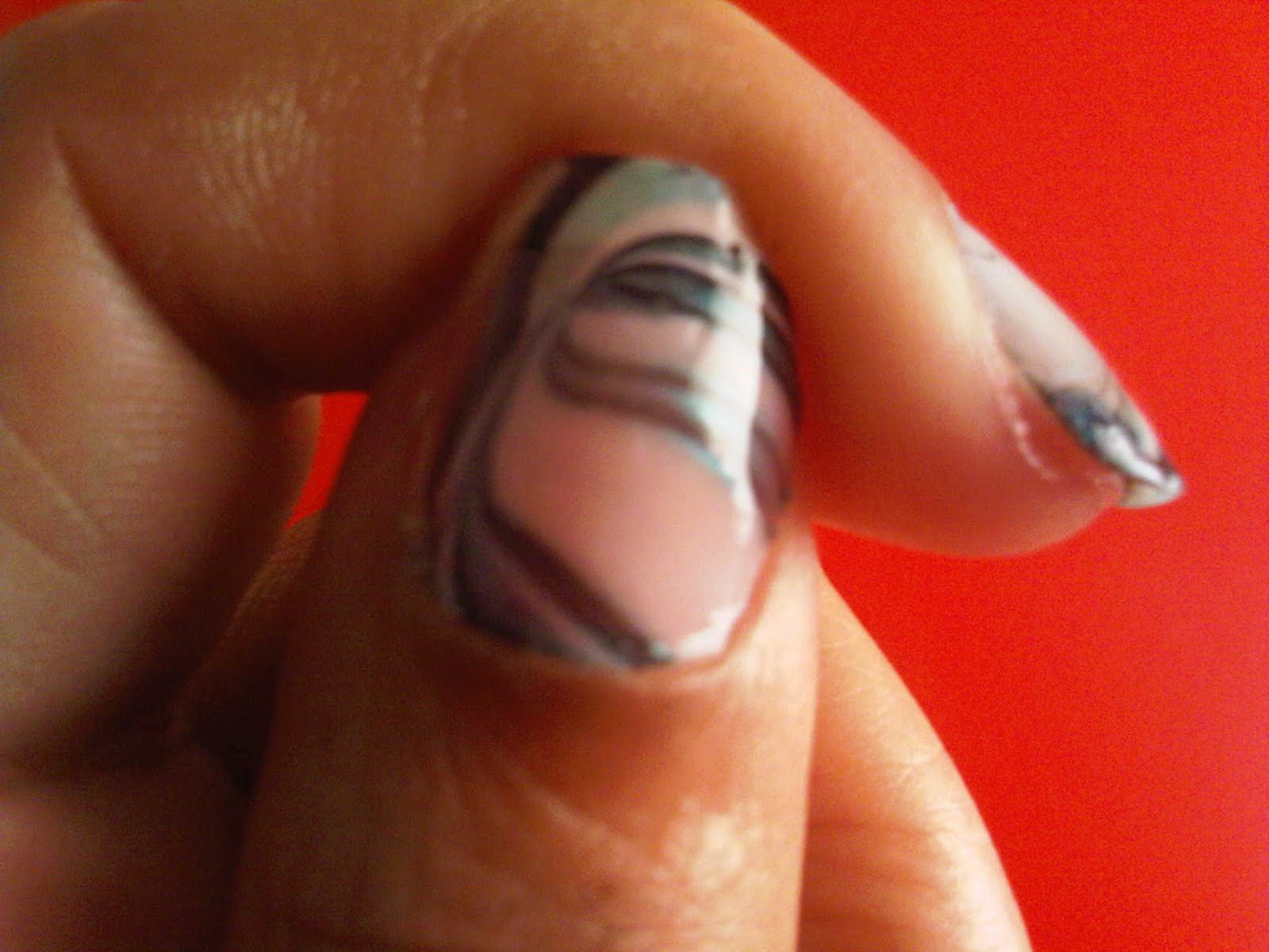 Next, drop your nail polish colors one at a time into the room temperature water. Don't overdo it - a drop at a time is just fine. Pour single drops of each color, one on top of the other, until you have what you want. Take a toothpick and run it through the drops of nailpolish to create a marbled effect. Here comes the fun part! Take your finger and dip it into the water on the part of the design you like best. Use a toothpick to clear out the excess polish from the jar, and remove your finger - Voíla! Marbled nails! Use your polish remover to get any extra stuff off of your fingers ;)